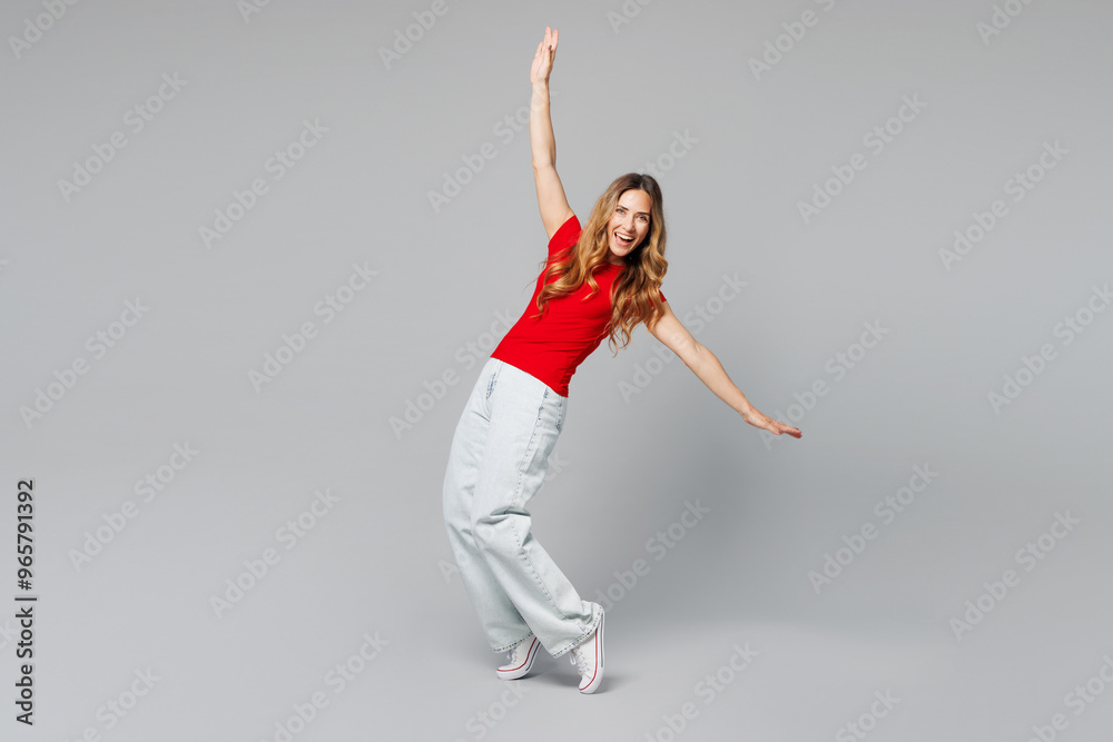 Full body young smiling happy woman she wear red t-shirt casual clothes standing on toes dancing lean back have fun spreading hands isolated on plain grey background studio portrait Lifestyle concept