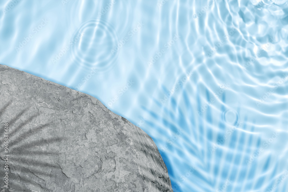 Summer Background, Shadow palm leaves on Rock Stone Podium over Water Texture banner for cosmetics product design,Backdrop Top view Display mockup on Swimming pool with Sunlight,Shadow on Blue water