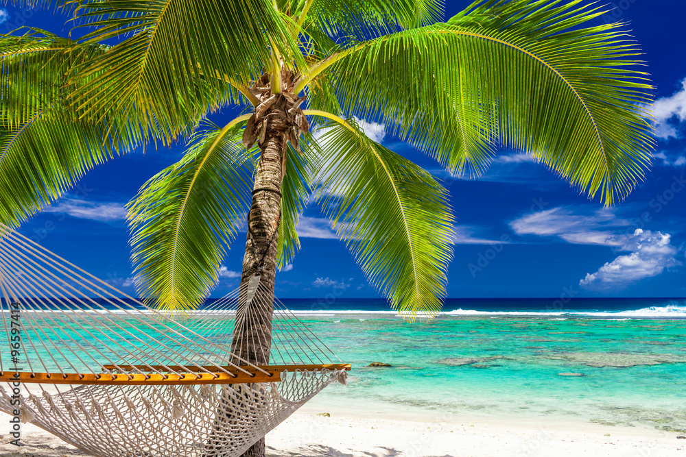 A palm tree with a hammock on the beach of Rarotonga, Cook Islan