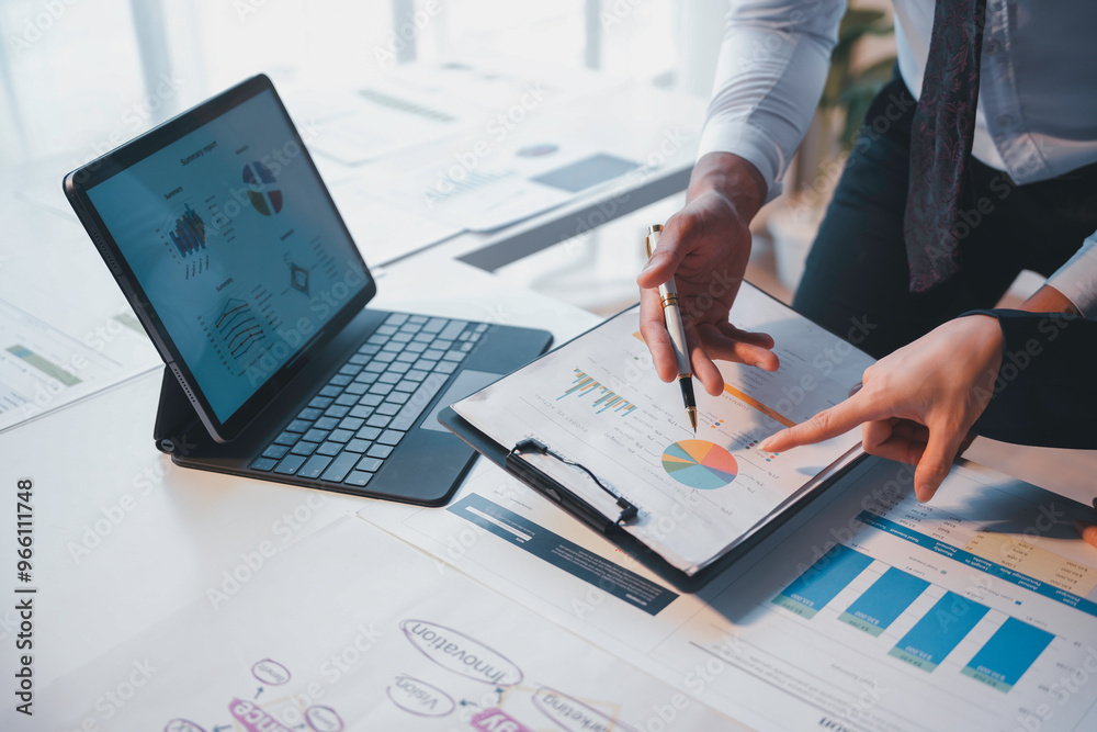 Business people analyzing financial charts and graphs on a desk