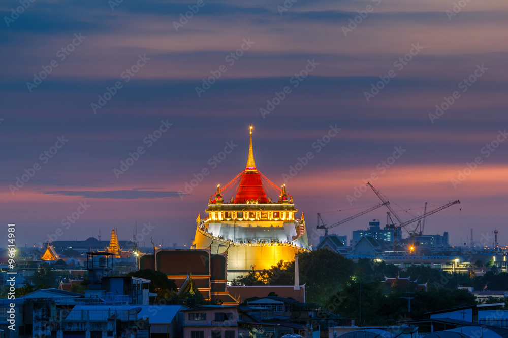 Golden Mount Temple Fair, Golden Mount Temple with red cloth in Bangkok at dusk (Wat Sraket, Thailand)