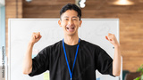 ガッツポーズで喜ぶ笑顔の男性ビジネスマン