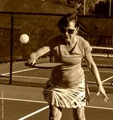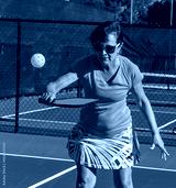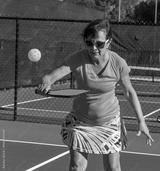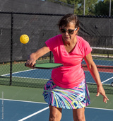 Female pickleball player shows who to do the bakhand volley