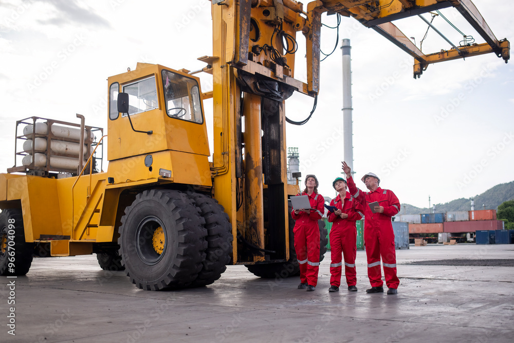 Engineer or worker are standing forklift or truck vehicle are holding detail and appear to be discussing or reviewing documents, likely related to inspect about factory and industry environment.