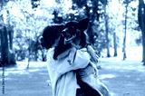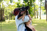 A woman holding her dog in her arms while walking through a green park, hugging her pet.