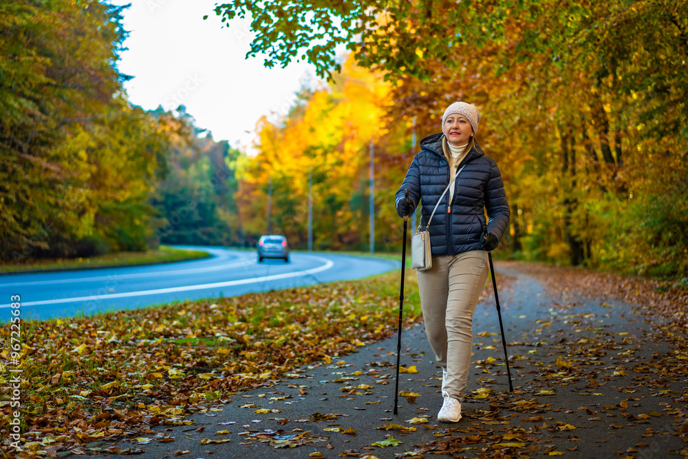 Beautiful middle-aged blonde woman in casual wear walking with poles on sidewalk by street in autumn scenery. Front view. Autumnal Nordic walking in city.