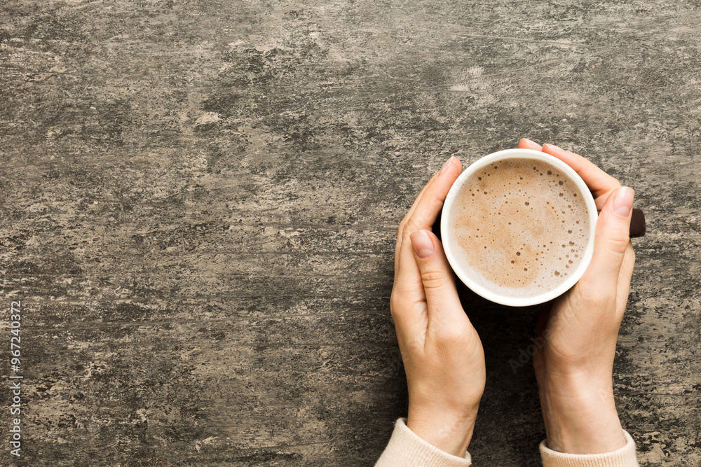 Minimalistic style woman hand holding a cup of coffee on Colored background. Flat lay, top view cappuccino cup. Empty place for text, copy space. Coffee addiction. Top view, flat lay