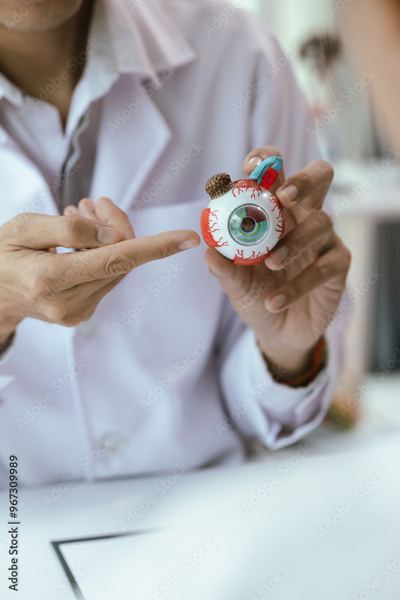 An elderly Asian woman visits an ophthalmologist at a clinic for an eye exam, addressing conditions like cataracts, glaucoma, and presbyopia, with advanced diagnostic tools for vision health.