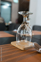 Table waiting for clients in a restaurant, with upside down water glass and tablecloth.