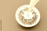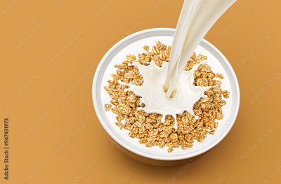 Bowl of granola with milk splash isolated on light beige background with copy space, top view