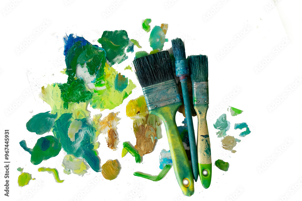 strokes of green paint on a palette, brushes for oil paints on a white background