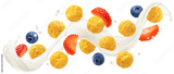 Flying corn balls with milk splash, blueberry and strawberry slices isolated on white background