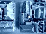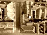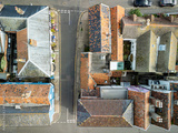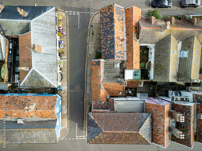Drone top down view of a collection of old terraced houses, courtyards and a public house seen in a typical English seaside resort.