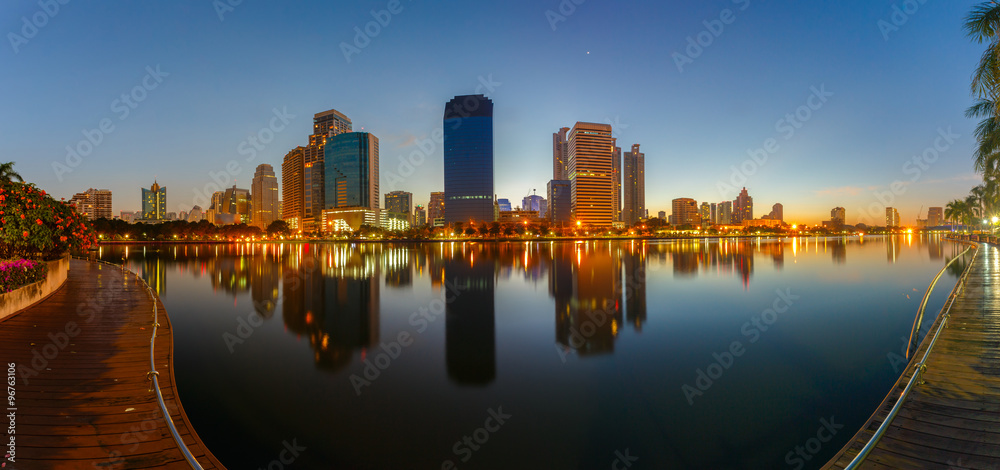 Panorama bangkok city downtown at sunrise with reflection in Bangkok,Thailand