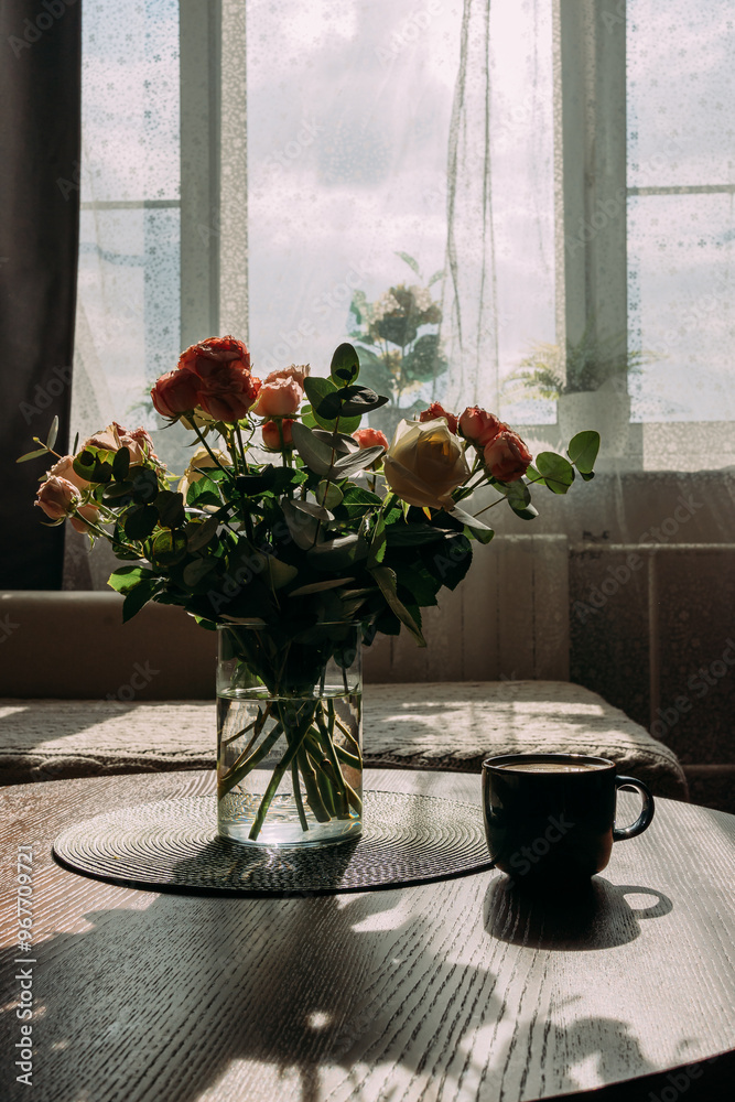 A bouquet of pink and white roses for the wedding anniversary for your beloved wife. A bouquet of flowers on the background of the window. A bouquet and a cup of coffee on the table