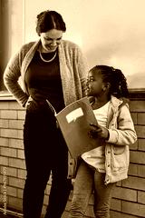 Girl, book and presentation in classroom with teacher, smile and together for development at academy. Child, oral and speech with notebook, education and learning for future with progress at school