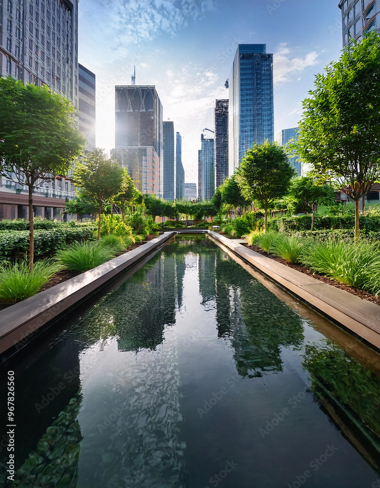 The greenery showcases a sustainable urban design with rain gardens and permeable surfaces strategically placed for managing stormwater runoff