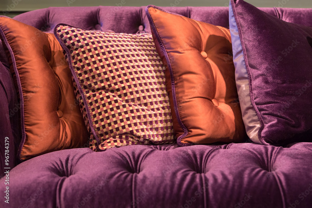 Close up of violet velvet sofa and cushions
