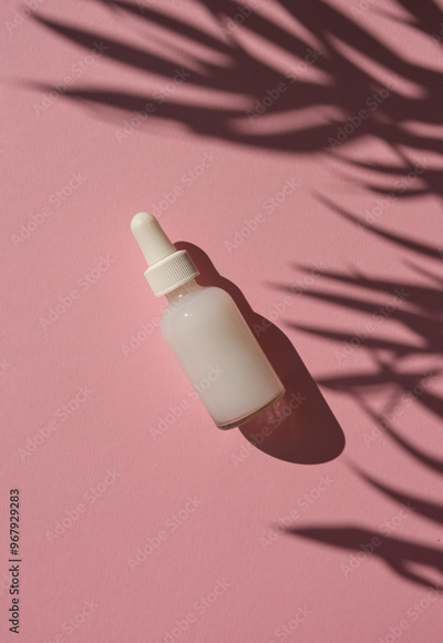 Cosmetic serum glass bottle on the pink background with palm leaves shadows.