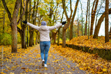 Woman wearing jeans, beige jacket and winter hat walking with arms spread out on alley full of yellow fallen leaves in park on autumn day. Back view