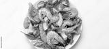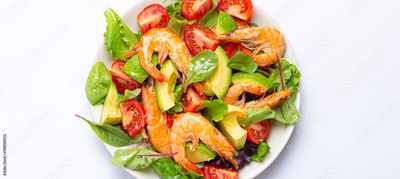 Healthy salad with grilled shrimps, avocado, cherry tomatoes and green leaves on white plate isolated on white background top view. Clean eating, nutrition and dieting concept..