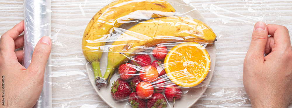 Male hands wrapping assorted different fruit and berries on white plate in plastic clear film top view on white wooden rustic table background