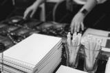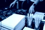 Process of checking in on conference congress forum event, registration desk table, visitors and attendees receiving lanyard with name badge and entry wristband bracelet and register electronic ticket