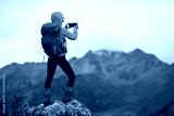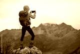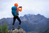 Hiking woman taking photo with smart phone on high altitude mountain top