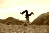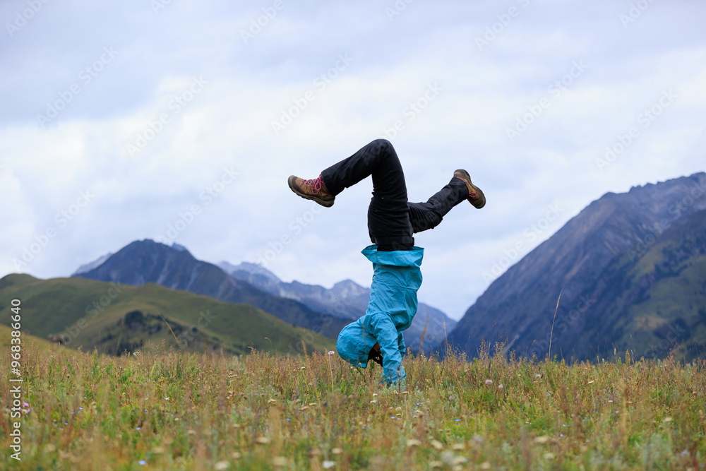 Woman hiker doing a handstand on high altitude mountain meadow