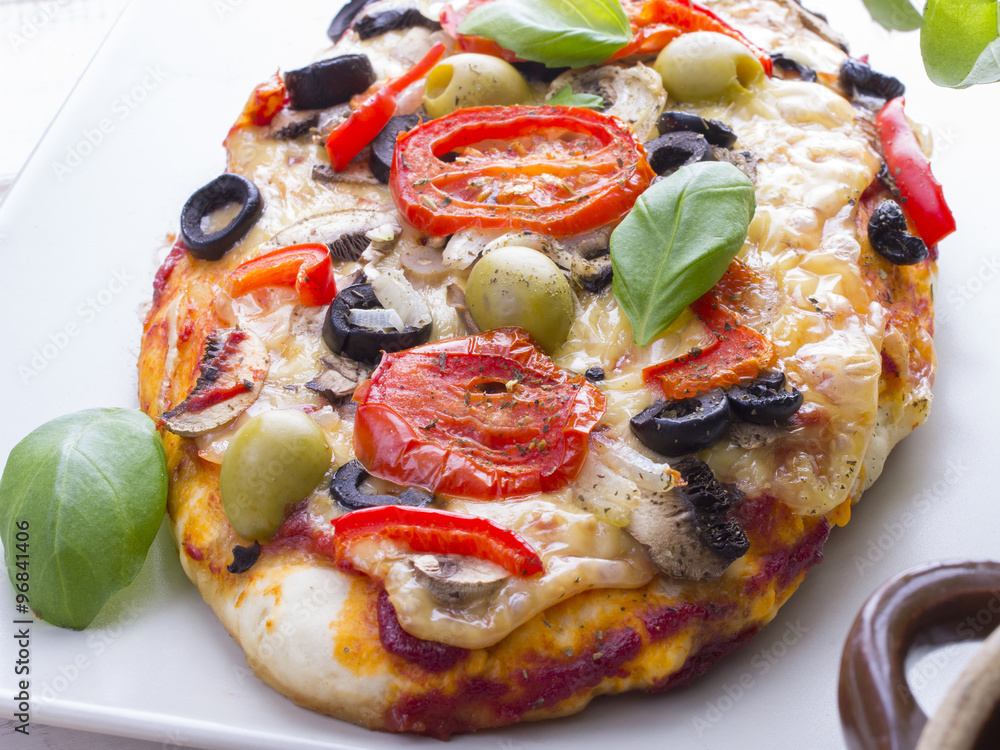 pizza with tomatoes, mushrooms, olives and peppers served on a plate on a wooden table