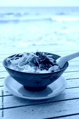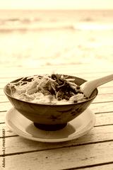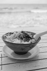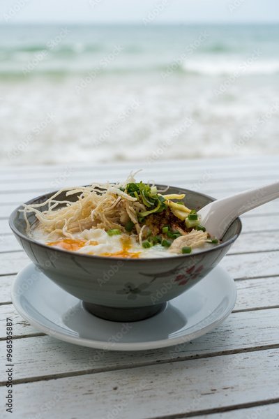Pork congee with egg, ginger, spring onion on wood table and view of the sea