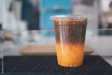 A tasty refreshing drink, iced Americano black coffee and a layer of orange. The concept of a fusion drink