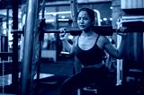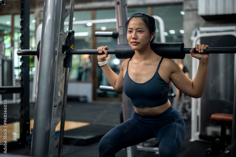 A sporty Asian woman in athletic wear is performing squats on the Smith machine at the gym.