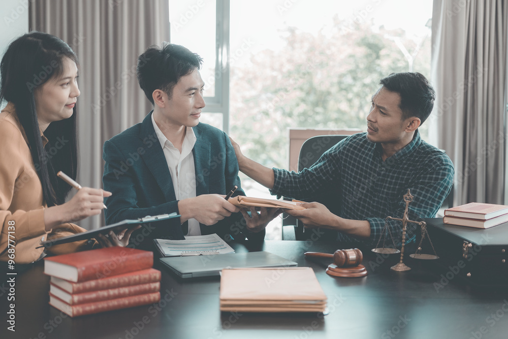 Male judges are advising clients on litigation requests and legal advice, representing clients in court, and assisting with legal documents. They study the law.