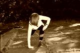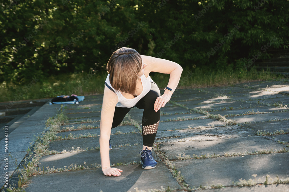 An adult woman is doing fitness in the park. The woman is doing lunges and squats.