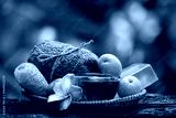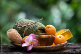 Glycerin soap mixed with apricot extract and honey on natural background.
