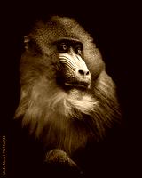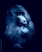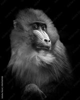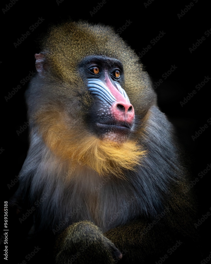 Close-up portrait of a mandrill with vibrant facial colors, set against a black background