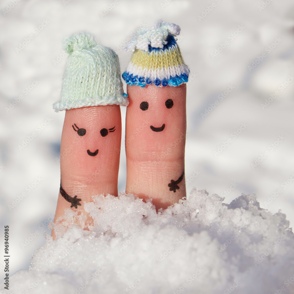 Finger art of a Happy couple on the background of snow. A man and a woman hug.