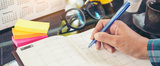 Planner plan Schedule Calendar and reminder agenda, work at home. Man hand planning daily appointment and write business trip in diary book at office desk. 2024 Calendar reminder event concept.