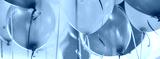 Balloon in Happy birthday party room background with string and ribbon (yellow, blue, violet, purple) helium Ballon floating in celebrate wedding day.Balloon in wedding and birthday party concept.