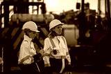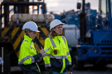 Engineer or worker standing forklift or truck vehicle are holding detail and appear to be discussing or reviewing documents, likely related to inspect about factory and industry worksite.