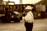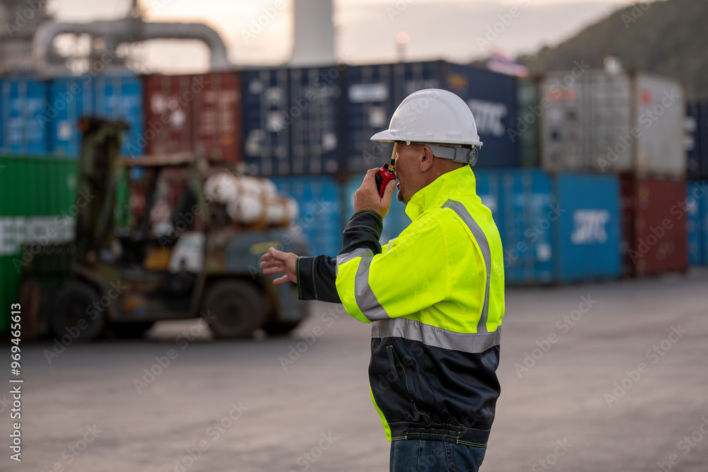Engineer or worker standing forklift or truck vehicle are holding detail and appear to be discussing or reviewing documents, likely related to inspect about factory and industry worksite.
