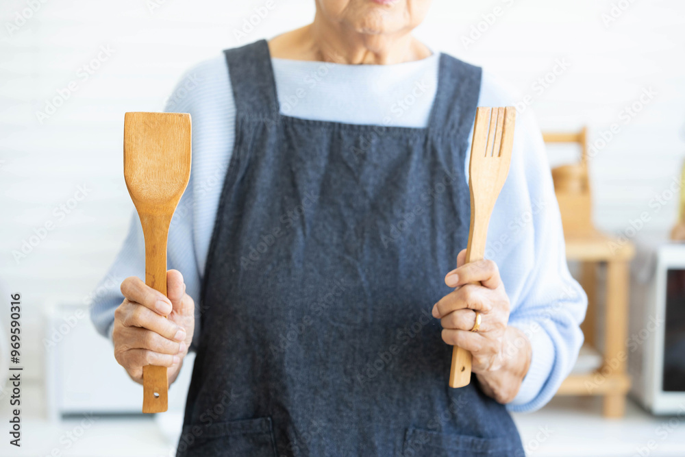 close up housewife hands holding and showing wooden spatula in the kitchen
