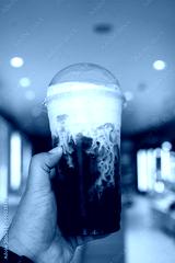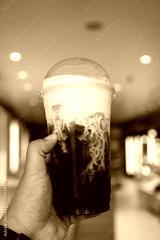 A glass of cold brew iced coffee with fresh milk cream swirl in hand at the coffee shop