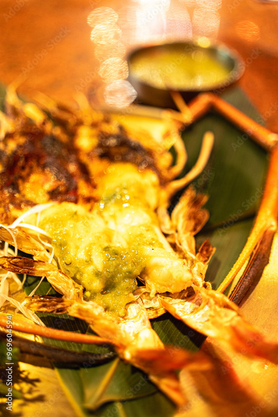 Delicious grilled river giant prawn with spicy seafood sauce.