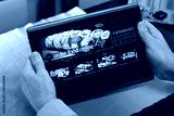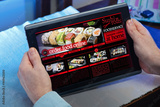 hands of a man in a website of a restaurant food delivery service in the tablet /man searching website internet restaurant to purchase food online with tablet in you home