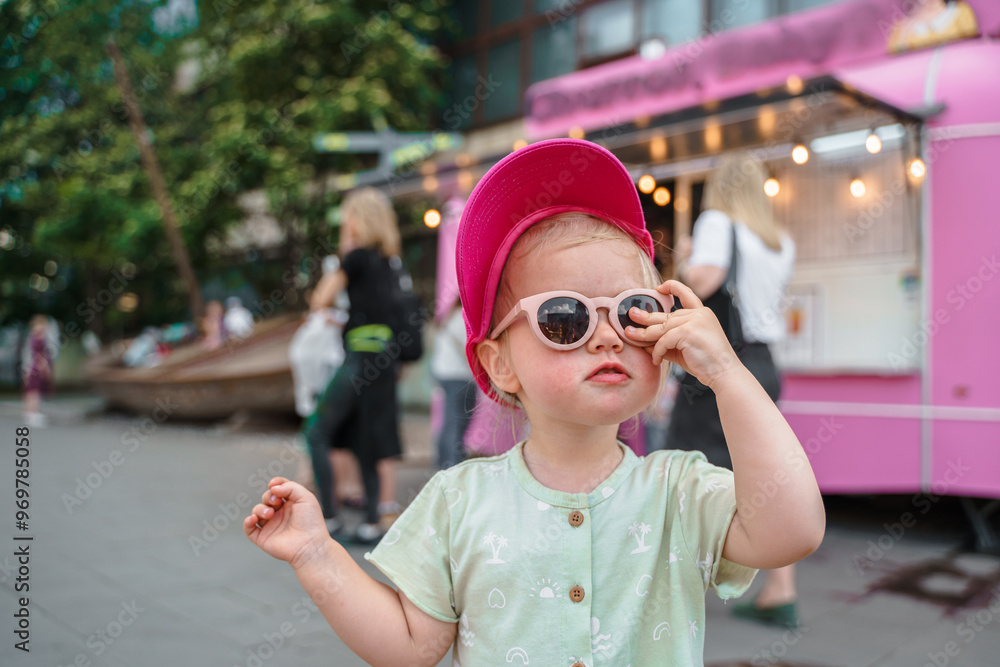 Portrait of a beautiful Caucasian child girl toddler in sunglasses in summer in the city.
