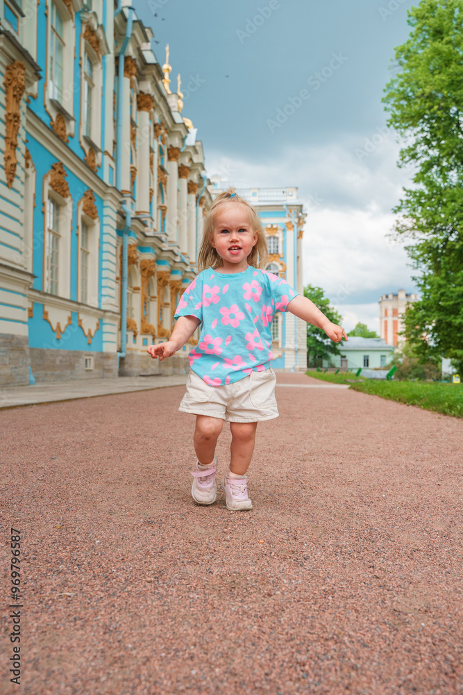 Little girl child walks to Catherine's Park with a palace, family tourism, active childhood.