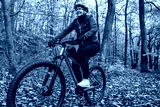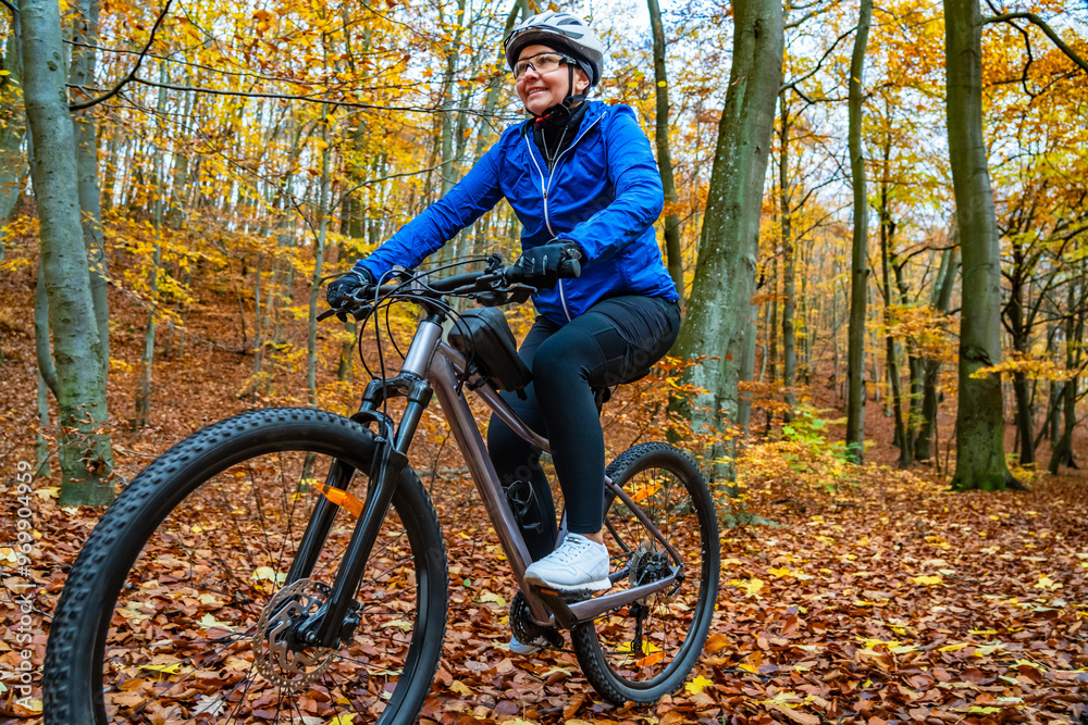 Portrait of middle-aged woman wearing blue sporty jacket, black cycling pants and white bike helmet riding bicycle in forest in autumn scenery. Happy physical activity