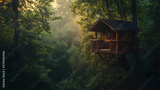 A treehouse with a hidden reading nook set high in the treetops with a panoramic view of the forest.
